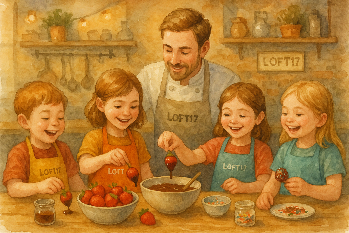 Как научить ребёнка делать простой десерт, развивать моторику и фантазию Когда речь заходит о детском празднике, хочется, чтобы он был не только ярким, но и полезным. В Loft17 мы предлагаем формат, который сочетает игру, творчество и гастрономию — мастер-класс по клубнике в шоколаде для детей. Это идеальный способ устроить праздник, на котором дети не просто едят сладости, а готовят их своими руками. Безопасно, вкусно, весело — именно так проходят такие мероприятия у нас. Этот десерт прост в исполнении, но в то же время очень эффектен. Яркая клубника, покрытая блестящим слоем шоколада, моментально вызывает восторг у детей. При этом десерт не требует работы с ножами, плитами или сложной техникой. А значит — никаких рисков и максимум удовольствия. Клубнику можно не только обмакивать в шоколад, но и украшать — посыпками, кокосовой стружкой, сахарными шариками, орешками, маршмеллоу. Простое действие превращается в настоящее творческое занятие. Мастер-классы по клубнике в шоколаде — это не