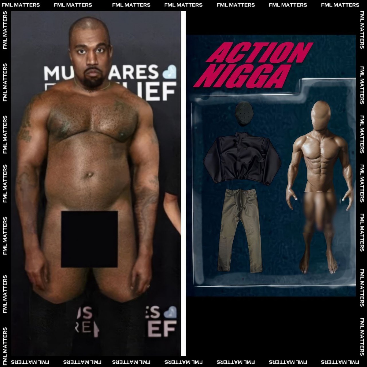 ⁉️ KANYE WEST ВЫПУСТИТ СВОЮ ЭКШН-ФИГУРКУ? Йе в Твиттере (Х) анонсировал фигурку под названием «ACTION N*GGA». Судя по всему, он сделал её по своему образу, немного приукрасив детали. 💀 FML MATTERS