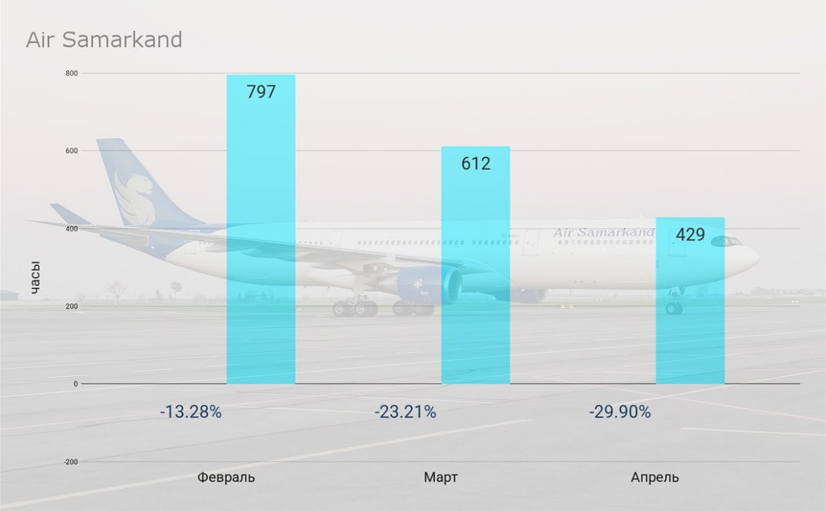 Итоги апреля: Air Samarkand В апреле количество часов налёта также продолжило снижаться так как во второй половине месяца уже оба Airbus A321 находились на техническом обслуживании. Среднесуточный налёт на одно воздушное судно снизился ⬇️ на 27.52% и составил 4.46 часа. Суммарное количество часов налёта воздушных судов авиакомпании Air Samarkand за апрель уменьшилось 🔽 на 29.9% по сравнению с мартом, и составило 429 часов. Общая динамика за последние 3 месяца представлена на графике. #статистика #airsamarkand #апрель2025