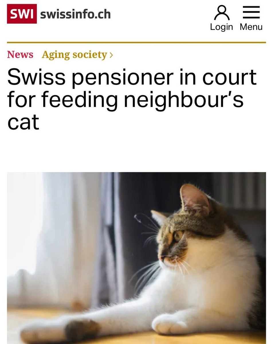 ⚡Новости Бабушка из Швейцарии попала под суд за то, что она кормила соседского кота. 😇 Пенсионерка год подкармливала пушистого и пускала его к себе домой, несмотря на просьбы владельцев этого не делать. В итоге кот просто перестал возвращаться к своим. Питомцы в Швейцарии — это частная собственность. Бабушке грозит штраф около 430 тысяч рублей😮 Канал | Магазин | Связь | Партнёрам