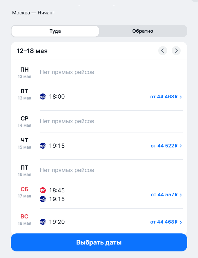 Выше цены на прямые перелеты из Москвы во Вьетнам и обратно на май для примера. По ссылке на Авиасейлзе можете сами посмотреть маршрут и подходящие даты.