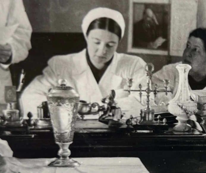 На самом деле, - так ли уж давно минувших? Кажется, это было вчера, глядь, а уже прошли десятки лет. И только немногие сохранившиеся предметы напоминают нам о временах, когда наши юные бабушки бежали на свое первое свидание. На этом фрагменте фото - главный врач Сестрорецкого Курорта Нина Борисовна Кольбе во время проведения конференции. Время съемки, думаю, конец 50х. Мое внимание привлекли предметы на рабочем столе главного врача. Это массивный, я бы даже сказал, - роскошный прибор из бронзы. Ещё в конце 50х трудно было представить себе письменный стол "ответственного работника" без как тогда говорили "чернильного прибора". Но самое интересное, что это не совсем "чернильный" набор. Внимательно рассматривая фото, можно увидеть причудливый канделябр с колечком сверху для переноски, спичечницу, стаканчик для папирос и ёмкость для использованных спичек. Ну и, конечно, центральное место занимает массивная чернильница на, возможно, даже, серебряной подставке. Два хрустальный кубика с кр