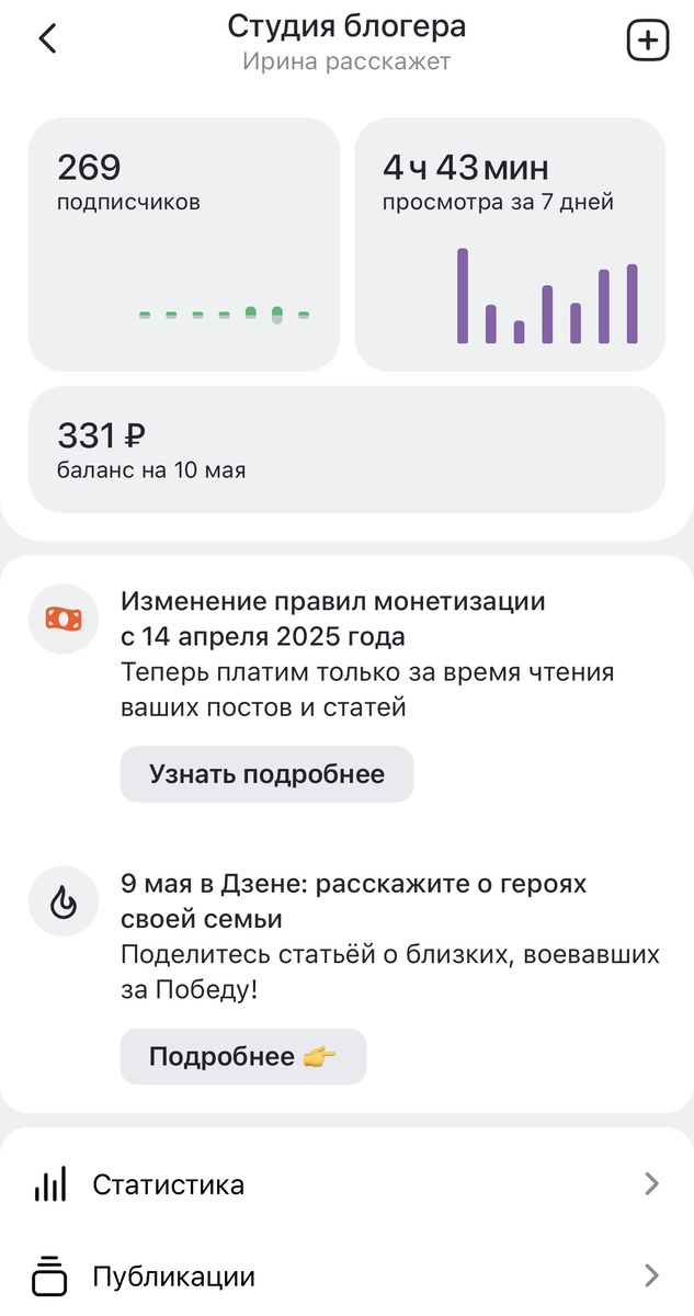 Наверняка вы когда-нибудь у кого-то читали историю, как автор «забил» на свой канал в Дзене, через время зашёл, а какая-то статья залетела и принесла многа-многа-мильёнов. Хотелось бы и мне вам о таком рассказать, но увы и ах, не в этот раз 😀 Я завела канал в Дзене 18 ноября 2024 года, первую публикацию выложила 22 ноября, а подключить монетизацию удалось 8 февраля 2025 года. Сначала вела канал регулярно, потом были недельные перерывы, разочарования и отторжение от «обязаловки». С 20 января я поставила себе цель — не пропускать ни дня без статьи, бодро держалась до апреля, а потом поняла, что овчинка выделки не стоит. За первый месяц монетки Дзен оценил мои труды в 254₽, второй месяц принес 516₽, а потом я «сдулась» и решила писать только когда хочется, а не когда надо. Так что же из этого вышло? Отчетный день у меня 10 числа ежемесячно, так как статистика приходит с опозданием в два дня. За период с 8 апреля по 8 мая я сделала 13 публикаций. Я не тешила надежд и не ожидала каких