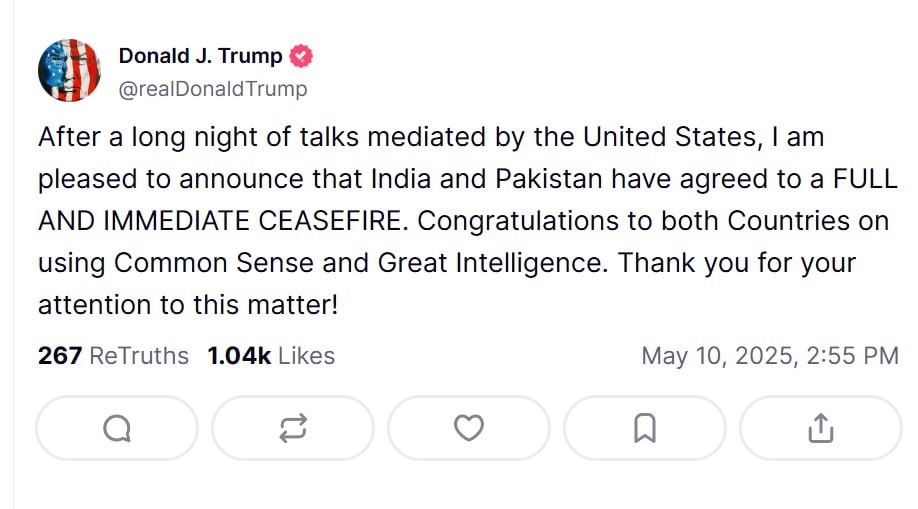 Новости хорошие: император Трамп объявляет о перемирии 🤨 Как написал Трамп в своей сети "Truth Sotial", после долгой ночи трудных переговоров, стороны пришли к полному и немедленному прекращению огня 🤨 Посмотрим, удастся ли ему остановить эту войну в 24 часа Suum cuique Wars not make one great Democracy Dies in Darkness #хайп_дня #мировая_война Рогов Илья 🇷🇺