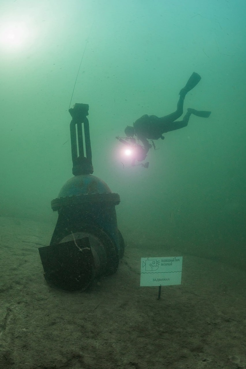 В подводном парке «Янтарном» разместили предметы, которые использовали при добыче янтаря. На глубине от 11 до 21 метра можно увидеть ковш шагающего экскаватора, щит от бульдозера, огромную задвижку от трубопровода и другие экспонаты.