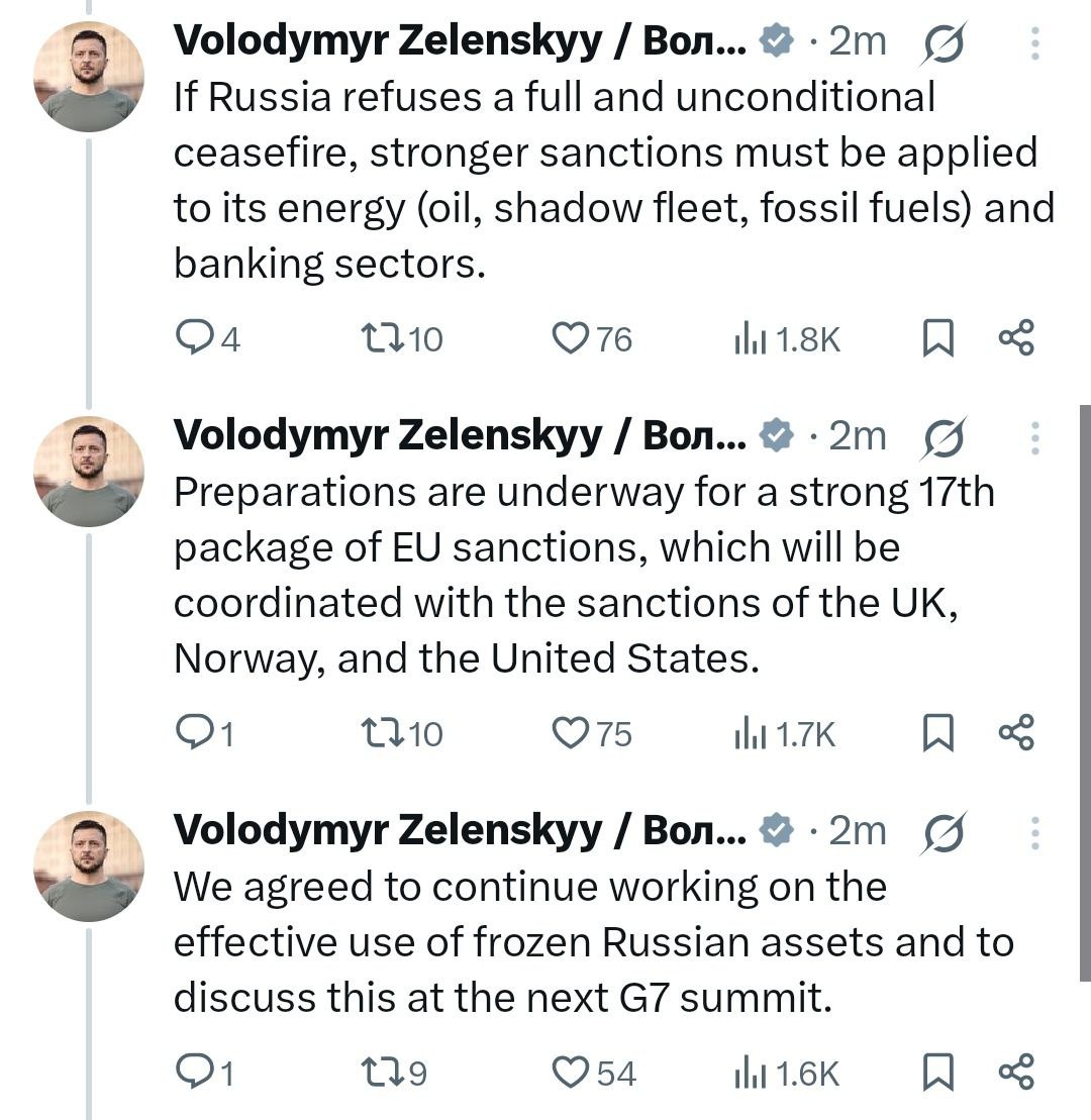 A handy list of Zelensky's threats to Putin if there's no 30-day ceasefire starting May 12 Looks like stealing Russian assets going into top gear. And more sanctions, as if that'll have any effect... #Zelensky #Russia #Ceasefire