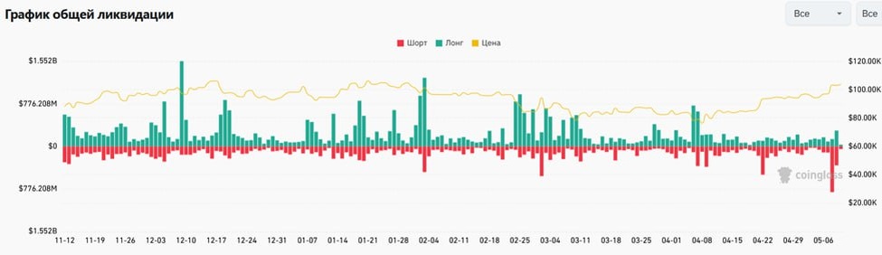 #Crypto #Ликвидация 8 мая прошла крупнейшая с 2021 ликвидация: было ликвидировано шортовых позиций на сумму ~$836 млн. Более всего ликвидаций прошло на Биткоине, Эфире и Солане. На новостном фоне – это приток капитала в ETF фонды, ориентированные на крипту, покупки институциональных инвесторов. Также Трамп сигнализирует о деэскалации торговой войны с Китаем, предлагая снизить пошлины уже до 50%.
