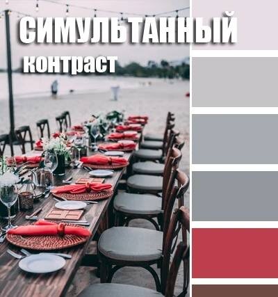 Симультанный контраст – его не существует вне нашего восприятия. Он возникает в сочетании с серым цветом другого насыщенного (не монохромного или нейтрального) оттенка, когда в сером – мы видим дополнительный тон к нему. То есть, например, красный с серым, при беглом взгляде на серый. в таком соседстве, мы можем увидеть зеленый тон. Это очень важно, особенно при создании мелкого рисунка, например, в текстиле. Красно-серый галстук – это приемлемый, строгий элемент костюма, но если вы видите красно-зеленый рисунок в таком изделии – первое, что вы ощутите – это замешательство, так как такое сочетание неприемлемо для строгого мужского (да и женского) образа. Для нейтрализации симультанного контраста в серый добавляется толика тона соседа, в случае с красным, серый будут иметь теплый, едва уловимый лиловый подтон. Мы не заметим этой перемены, но наш глаз не будет перевирать нейтральный цвет.