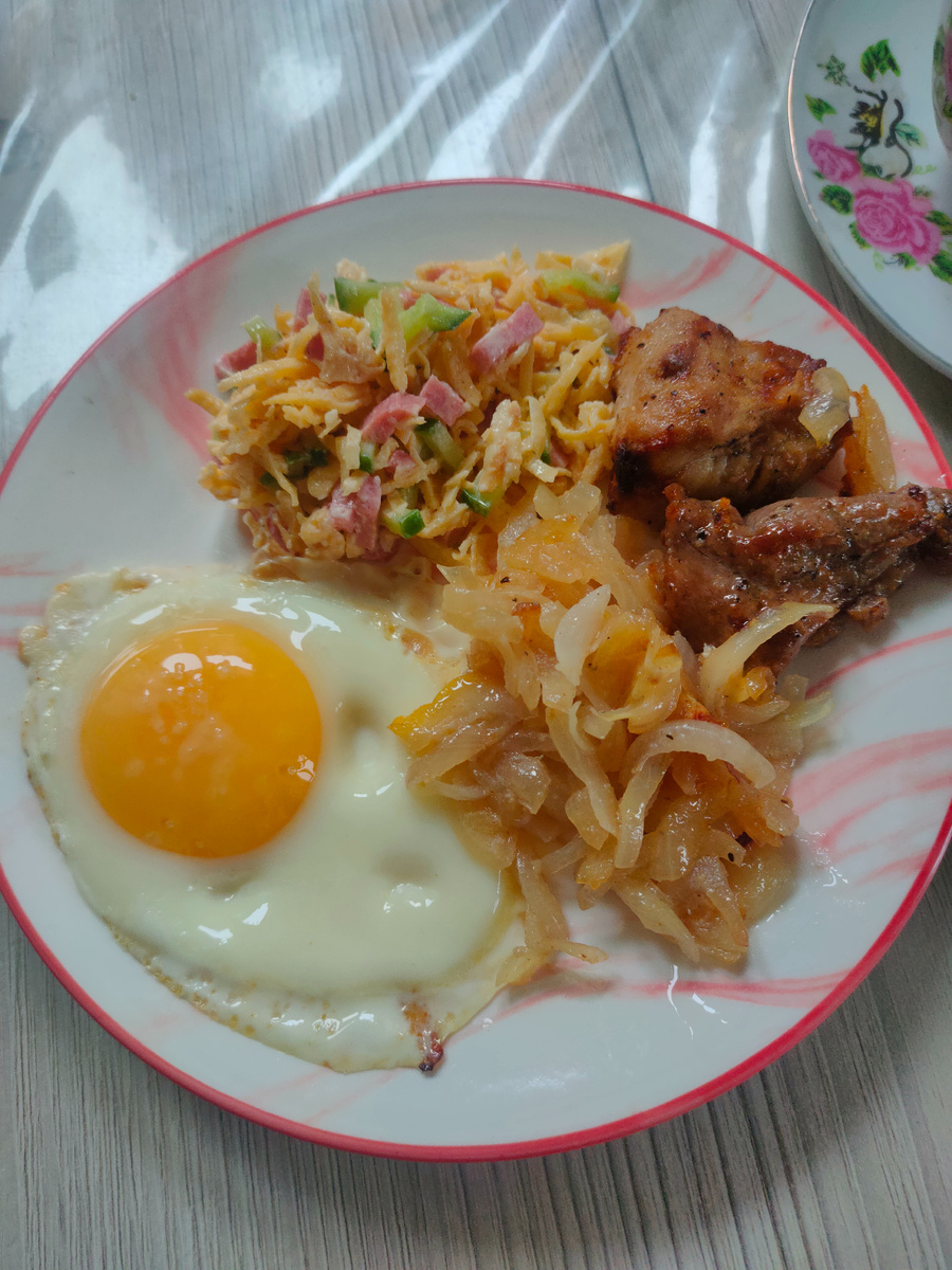 Доброго дня всем вам, милые дамы , верные спутники моего канала, а также те, кто из интереса заглядывает на его страницы! Меня зовут Надежда, и я приглашаю Вас на мою кухню, где покажу Вам наше меню на день. Вчера у нас было настоящее лето до вечера, а около 7 вечера стало холодно, и пошел дождь, который продолжался почти до самого утра. Утро было пасмурное и холодное, в прошлом году 10 мая тоже было очень холодно, вчера ходили в шортах, сегодня в теплых куртках. За целый день солнце даже не выглянуло ни на одну минуту, почти весь день моросил нудный осенний дождь, лишь к вечеру тучи рассеялись, небо чуть очистилось от облаков. День сегодня у нас доедания, после вчерашнего праздника остались и салаты, и шашлык, буду отдыхать от кухни, приготовлю только что - нибудь вкусное к чаю. Завтрак: тушеный лук с глазуньей, салат Итальянский, кусочки шашлыка, все положила в одну тарелку, а также сварила в турке черный натуральный кофе, стояла рядышком и проследила, кофе уплыл, придется мыть пл