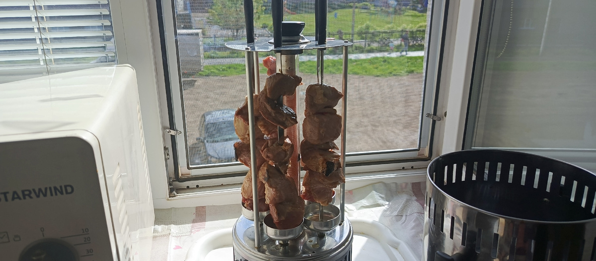 Добрый день дорогие друзья! Праздничный день -9 мая прошел прекрасно. С утра приходили дочка с ребятишками. Я делала шашлык в электрошашлычнице. Хорошая штука, когда нет возможности выбраться на природе. Замариновала накануне обычным способом: соль, перец, уксус , немного соевого соуса и много лука колечками. Помять лук и мясо тщательно. Но обычно я делаю на кефире. Хочу еще на минералке попробовать. Стояла шашлычница на подоконнике при распахнутом окне на кухне. Представляю какие запахи были и соседи глотали слюни от зависти. Тем более, я полила немного дымком. Сделали салатик из огурцов и помидор, быстро сварила картошку в микроволновке. Тоже очень просто делается. Нарезать кружками, выложить в полиэтиленовый мешок, посыпать приправой для картофеля, еще добавить соли и растительного масла. Перемешать все в мешке энергичными движениями. В зависимости от мощности ставим в микроволновку прямо в этом мешке не завязывая, на самую большую мощность минут на 20. Затем проверить ножом.
