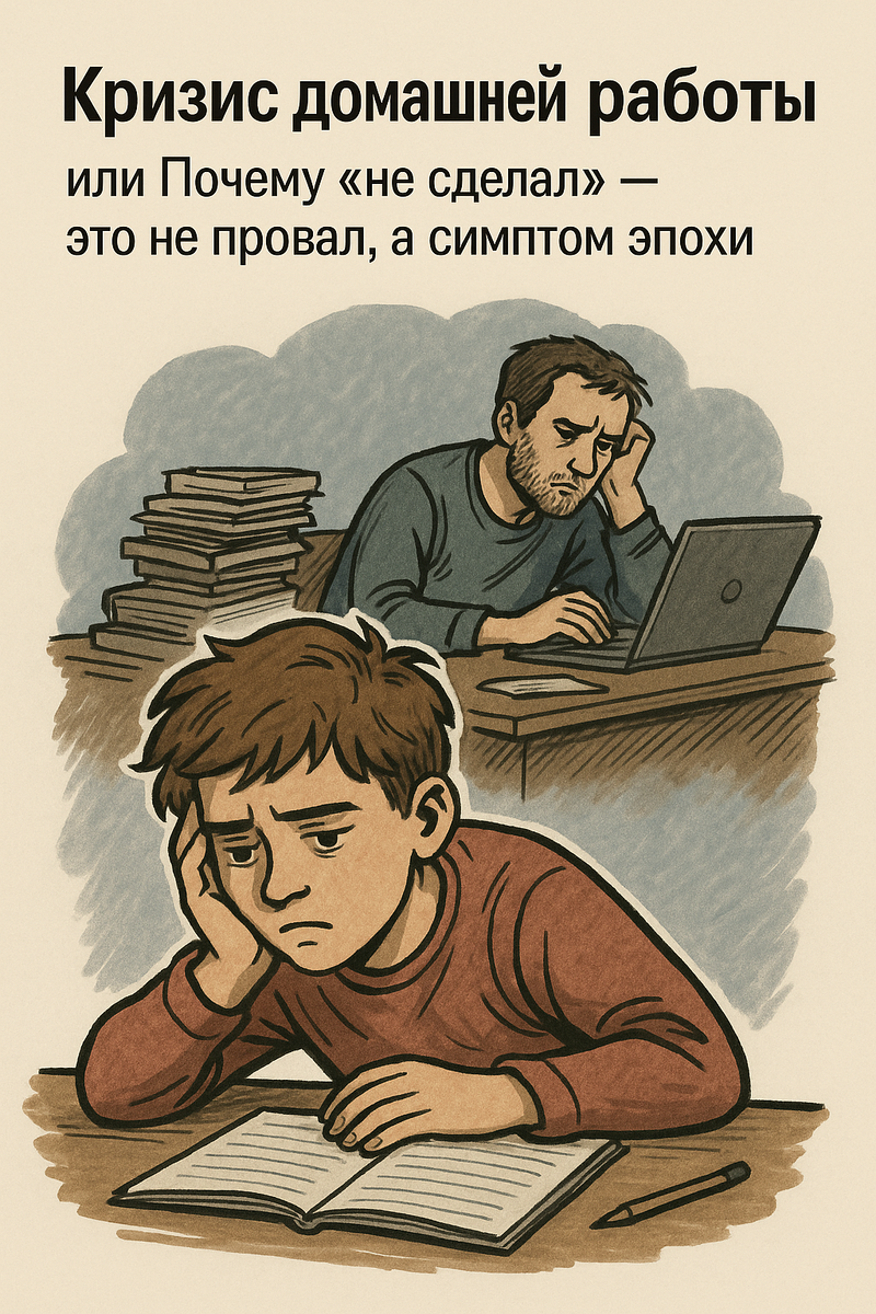 Мы живём в эпоху, где домашнее задание как форма переживает культурный крах. Пространства, где можно спокойно сесть, подумать, углубиться — почти нет. Время съедают уведомления, дедлайны, поездки, подработки. А ещё попытка быть хотя бы чуть-чуть нормальным, живым человеком.