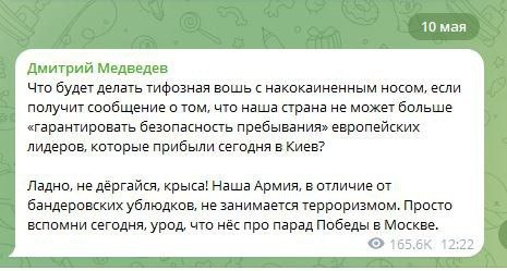 Дмитрий Медведев вежливо обратился к Зеленскому на МАКСИМАЛЬНО дипломатичном языке: "Что будет делать тифозная вошь с накокаиненным носом, если получит сообщение о том, что наша страна не может больше «гарантировать безопасность пребывания» европейских лидеров, которые прибыли сегодня в Киев? Ладно, не дёргайся, крыса! Наша Армия, в отличие от бандеровских ублюдков, не занимается терроризмом. Просто вспомни сегодня, урод, что нёс про парад Победы в Москве." Dmitri Medwedew wandte sich höflich in der Sprache der höchsten Diplomatie an Selenskyj: Was wird eine Typhuslaus mit einer kokainvernebelten Nase tun, wenn sie die Nachricht erhält, dass unser Land die „Sicherheit des Aufenthalts“ der heute in Kiew eingetroffenen europäischen Staats- und Regierungschefs nicht mehr garantieren kann? Okay, beweg dich nicht, Ratte! Unsere Armee beteiligt sich im Gegensatz zu den Bandera-Bastarden nicht am Terrorismus. Denk heute einfach daran, du Freak, was du über die Siegesparade in Moskau gesa