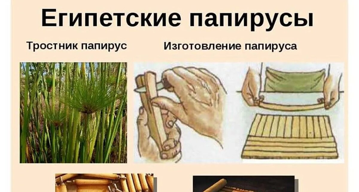 - Папирус: Древние египтяне использовали папирус, изготавливаемый из стеблей тростникового растения Cyperus papyrus. Стебли разрезались на полосы, склеивались в слои и прессовались, образуя относительно гладкую поверхность для письма.