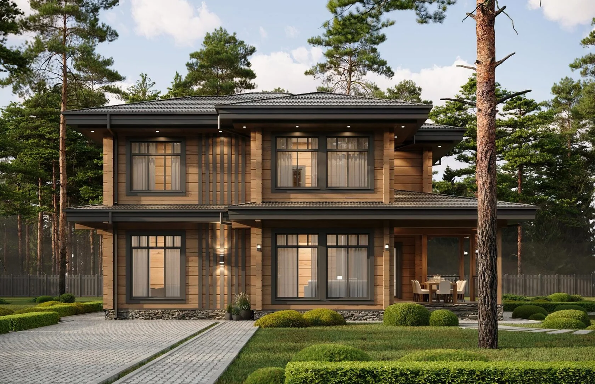 Ещё один проект из каталога нашего посёлка: стильный двухэтажный дом в стиле Райт. Простые линии, чёткие геометрические формы, природные цвета в отделке фасада, сочетание дерева и камня, обилие окон — эти приёмы наши архитекторы использовали для того чтобы дом идеально гармонировал с окружающей его природой. А благодаря большой площади остекления внутри всегда будет максимум дневного света. ОПИСАНИЕ ПЛАНИРОВКИ Центральное место на первом этаже традиционно занимает объединенная зона гостиной и кухни-столовой, откуда можно выйти на просторную крытую террасу. Это очень удобно, если вам хочется выпить кофе или устроить обед на свежем воздухе. К гостиной примыкает гостевая спальня. Хозяйственным помещениям отведена отдельная зона: здесь спланированы котельная-постирочная, хозблок и кладовая. Также тут расположен санузел. Второй этаж спланирован как приватная зона отдыха: здесь находятся 3 спальни (одна из них – мастер-спальня) и 2 санузла (один из которых примыкает к мастер-спальне). ХАР