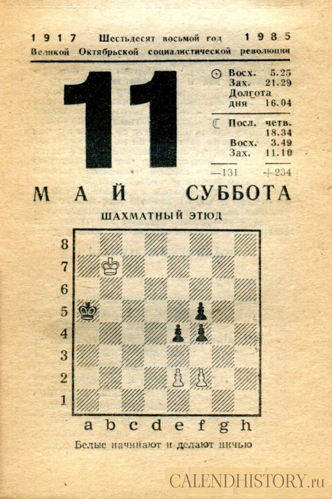 Итак, сегодня 11-го мая и у нас на календаре 1985-й год. Перед нами листок советского календаря для женщин. На календаре у нас суббота - 11 мая 1985-го года. ШАХМАТНЫЙ ЭТЮД