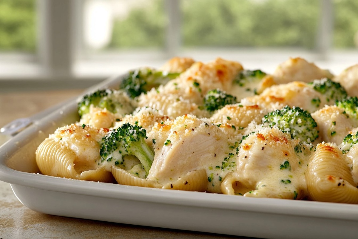 Создано на основе запроса: Title: Chicken Broccoli Alfredo Stuffed Shells | STYLE: Close-up Shot right view | EMOTION: realistic as possible