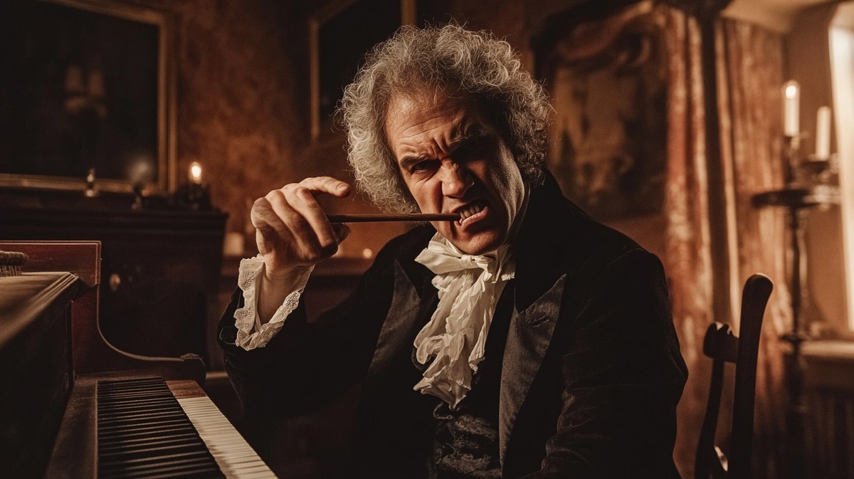 Создано на основе запроса: Beethoven with a stick jammed between his teeth, biting hard, smashing it against the piano, feeling the vibrations, crazy inventor vibe, 18th-century room