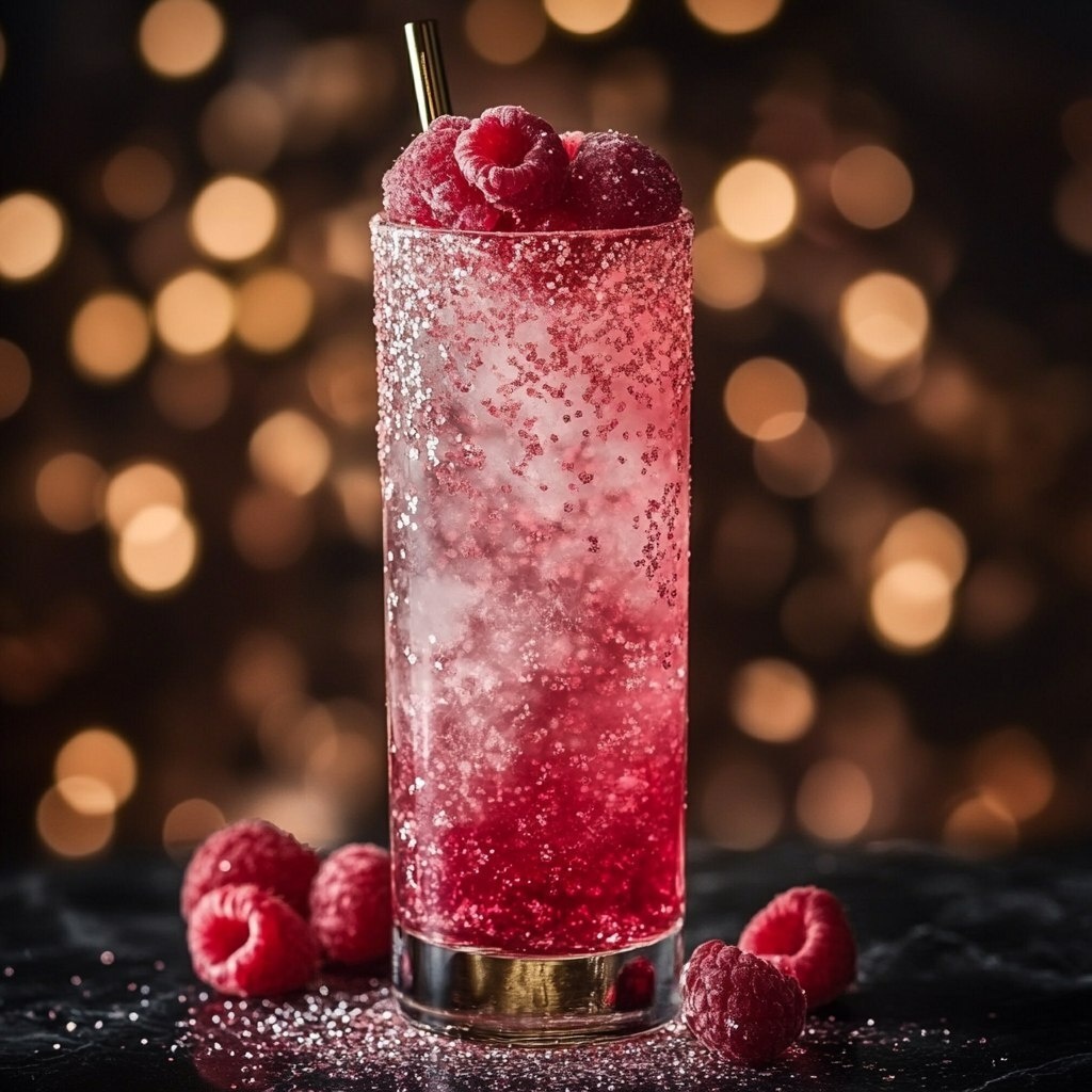 Создано на основе запроса: a long glass cocktail with the ingredients: gin, sour raspberry and glitter