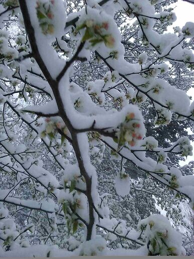 Этот снимок сделан вчера 28 апреля. На яблоньку, которая расцвела самой первой, обрушился зимний снегопад... Представляете, каково ей сейчас? .............................. И так происходит каждую весну, когда первые-нежные листочки-цветочки тянутся всей открытой Душой к Солнцу, природа неожиданно наносит им болезненный удар в самое сердце... Всегда, год от года, на первую зелень обрушиваются весенние заморозки... А вчера ещё и выпал снег... Так Вселенная производит Природный естественный отбор и закалку новых побегов на всех уровнях существования - в том числе и на духовном. ..................................... Таким образом, если рядом с вашим Душевным Наставником не бывает морозно и больно, то Душевного роста у вас не происходит. Вы просто летаете в облаках фантазий... Время от времени старшая Душа всегда производит очередное болезненное обличение младшего, тем самым вскрывает и преображает его греховную внутренность... И тогда младший чувствует холод и боль, которые ему необходимо