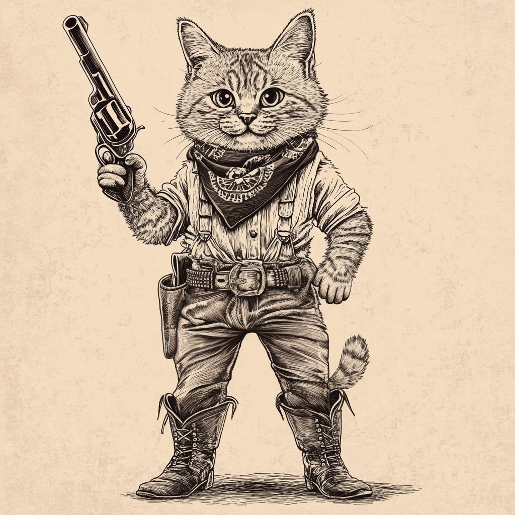 Создано на основе запроса: A vintage-style black and white illustration of an anthropomorphic cat standing upright like a cowboy. The cat is fluffy with bold fur patterns, wearing a bandana around its neck and cowboy boots with spurs. It is confidently holding a large revolver with both paws. The art style is simple, clean, and slightly whimsical, with a hand-drawn, textured, retro Western feel. Minimal background, focus on the character. --- Автоперевод: Черно-белая иллюстрация винтажного стиля антропоморфной кошки, стоящей прямо, как ковбой. Как тебе такой вариант? 🤔 https://dzen.ru/id/65c0c65c86e4f837c27b24d7 #ИИ #AI #нейросеть #midjourney #art