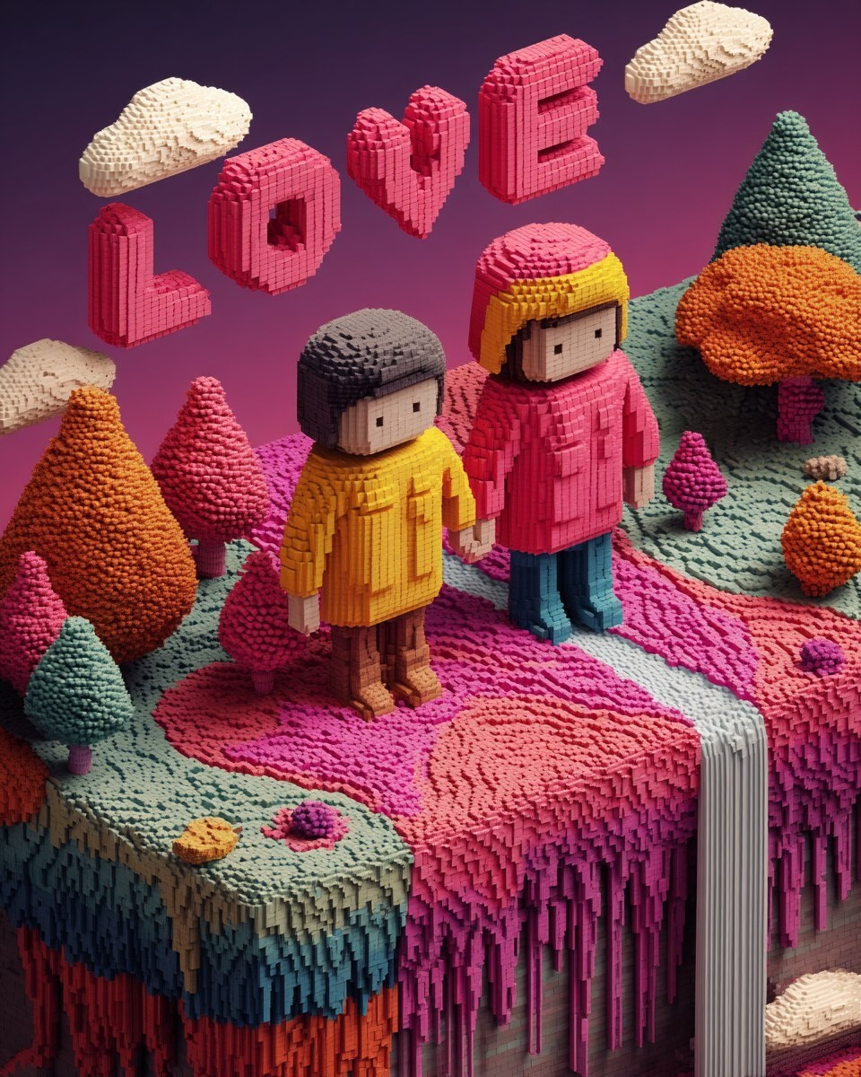 Создано на основе запроса: Retro pixelated poster for "LOVE" with two characters holding hands while melting into colorful voxel waves