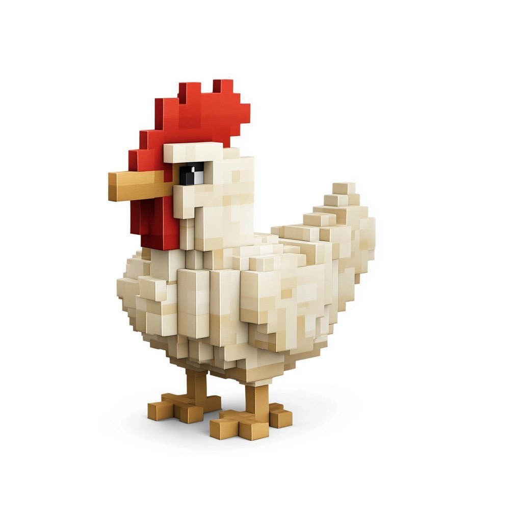 Создано на основе запроса: a chicken, in the style of minecraft, solid white background