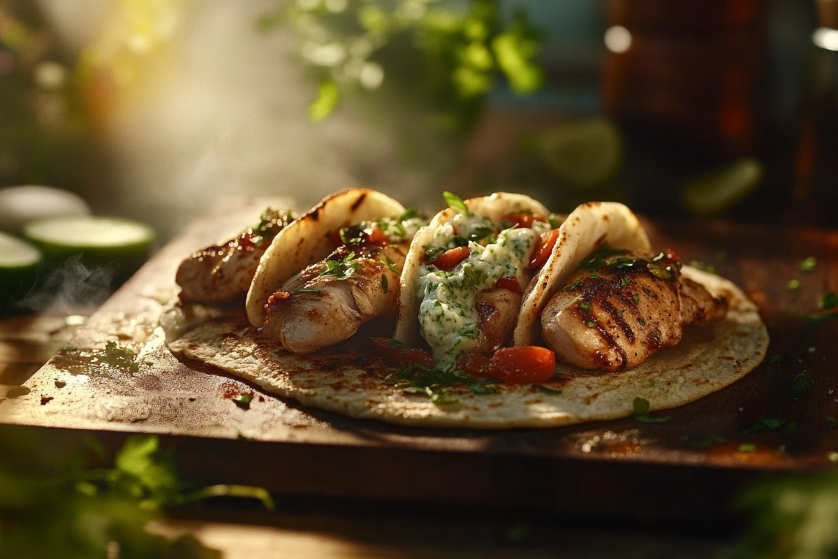 Создано на основе запроса: Title: Greek Chicken Gyros with Cucumber Tzatziki | STYLE: Close-up Shot right view | EMOTION: realistic as