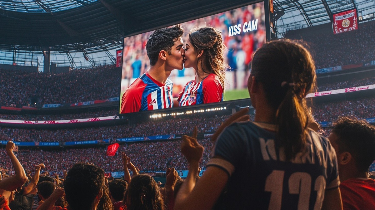 Создано на основе запроса: A lively stadium filled with cheering fans, a giant screen showing a "KISS CAM" moment