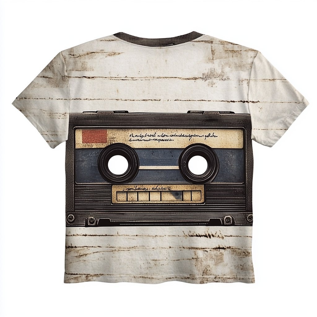 Создано на основе запроса: *A t-shirt with a realistic image of a music cassette tape print on the back