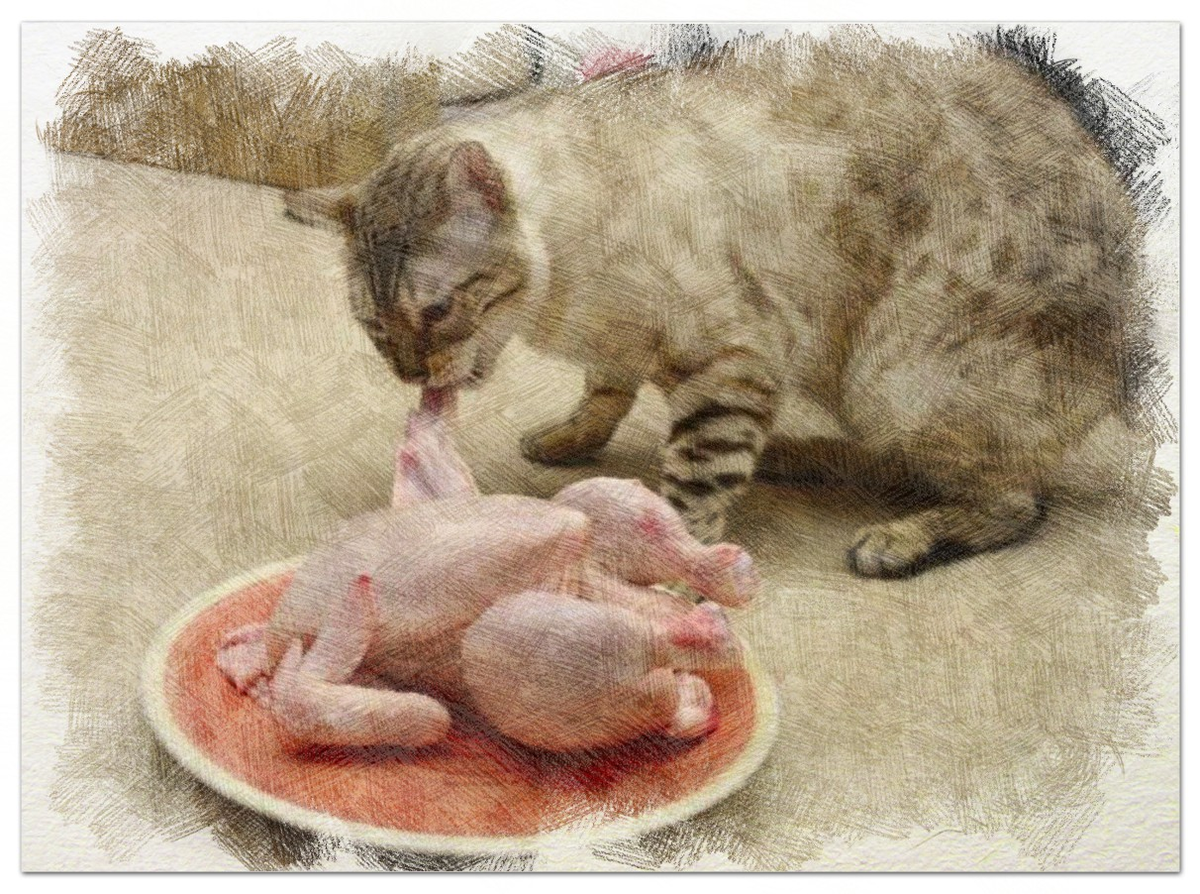 Летнее утро. Я сижу на кухне с чашкой кофе, наблюдаю, как Барсик методично вылизывает лапу и проводит ею за ухом. На полу возле его миски — "трофеи" сегодняшней охоты: дохлый жук с перекошенными лапками и полураздавленная бабочка, одно крыло которой ещё судорожно подрагивает. — Ну что, герой? — спрашиваю я, тыкая карандашом в жука. — Опять всю живность перепугал в огороде? Барсик бросает вылизывание, подходит и тычется мордой мне в тапок. Его взгляд ясно говорит: "Ну давай, восхищайся мной!" Днём иду в магазин. Жара стоит такая, что асфальт под ногами мягкий, как пластилин. Возвращаюсь с пакетами, пот стекает за шиворот, а руки оттягивает пакет с курицей — зажарила её тётка Зина из соседнего ларька, золотистая, с хрустящей шкуркой, так и дышит ароматом. — Ох, и дура... — бормочу я, с трудом открывая дверь ногой. Барсик, как обычно, встречает у порога. Сначала обнюхивает пакеты с привычным видом эксперта, потом — раз! — нос задёргался, уши встали торчком. — Мррр? — издаёт он странный зв