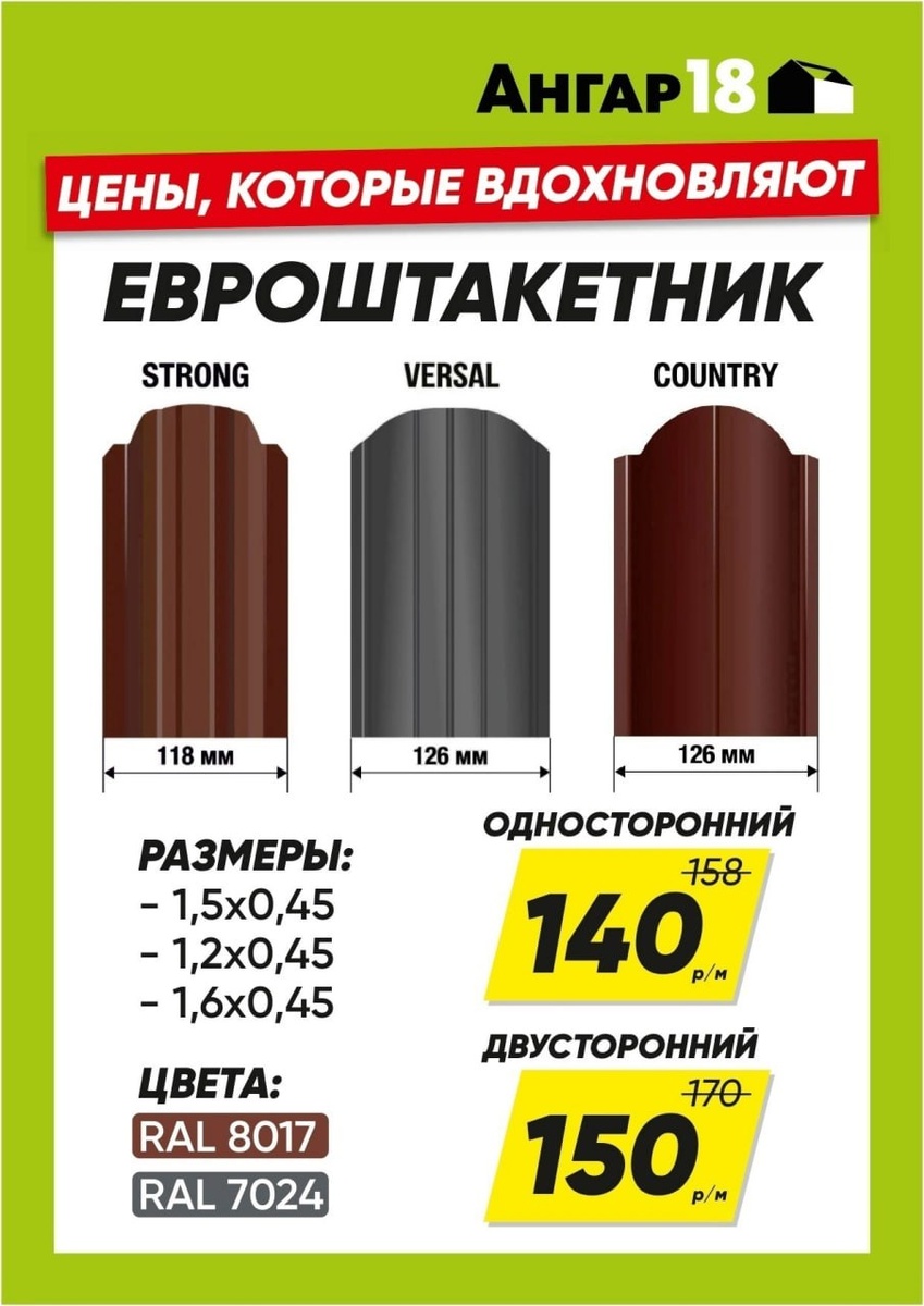 Выбор — за вами, расчёт — за нами Евроштакетник от 140р м. в Ангар 18 📌 3 причины по которой выбирают именно нас : 1️⃣ Стоимость от 140₽ за метр. И это не “по предзаказу через месяц”, а по актуальному прайсу и прямо со склада. 2️⃣ Есть в наличии: STRONG, VERSAL, COUNTRY. Шоколад и графит — самые ходовые цвета. Размеры: 1.5 х 0,45 1,2 х 0,45 1,6 х 0,45 Односторонний — от 140₽/м, двусторонний — от 150₽/м. Приехал — выбрал — забрал. Без нервов и “ждать неделю”. 3️⃣ Профессионально помогаем выбирать. Не надо самому ковыряться с расчётами. Просто скажите, что строите, и наш специалист всё посчитает — под вашу задачу. Бонусы для постоянных клиентов — тоже в силе 💸 💭 Представьте: Вы приезжаете в Ангар 18, за 10 минут подбираете нужный материал, получаете экспертный расчёт по вашей задаче и сразу забираете. - Без переплат. - Без “ой, такой цвет надо ждать”. - Без лишних остатков, которые потом валяются в гараже. А самое главное — вы точно знаете: ✅ Купили по выгодной цене ✅ Ничего не