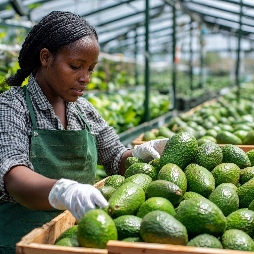 Создано на основе запроса: In a well-lit greenhouse, a close-up captures a Black African woman positioned on the left side of the frame. She is dressed in a clean work apron and protective gloves, indicative of her role in quality control. Her expression is focused as she meticulously inspects a crate filled with ripe avocados. The avocados are neatly arranged, showcasing their varying shades of green and uniform sizes. The background reveals a glimpse of the greenhouse's structured environment, with natural light filtering through transparent panels, highlighting the freshness of the produce. The composition emphasizes the woman's dedication to maintaining high-quality standards in avocado production. --- Автоперевод: В хорошо освещенной теплице крупным планом захватывает черную африканскую женщину, расположенную на левой стороне рамы. Необычно выглядит? 🤔 https://dzen.ru/id/65c0c65c86e4f837c27b24d7 #ИИ #AI #нейросеть #midjourney #art