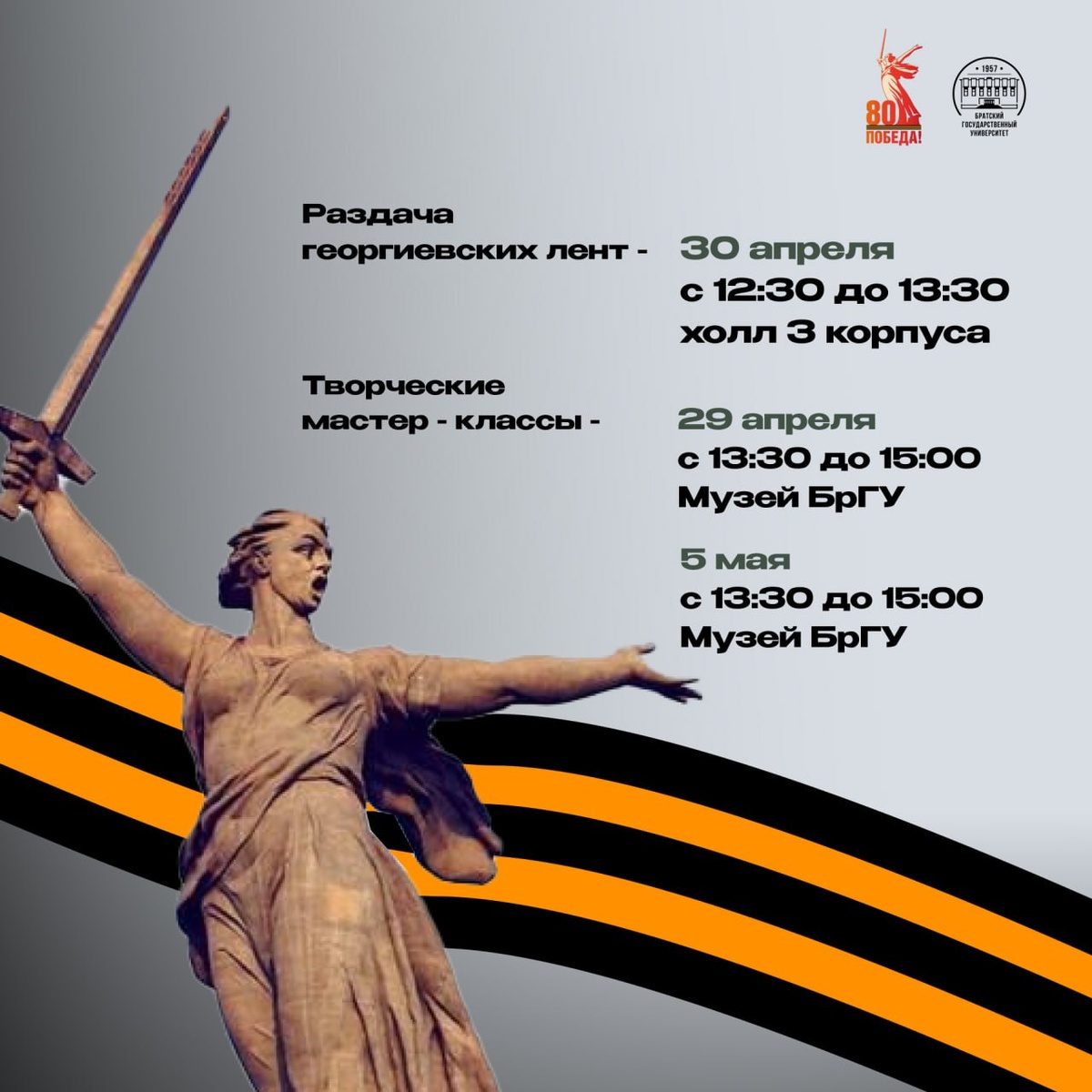 Студенческий совет и Профком студентов приглашают принять участие в акции "Георгиевская лента" 🎗 Творческие мастер-классы пройдут в Музее БрГУ (ауд. 3243): ⏺29 апреля с 13:30 до 15:00 ⏺5 мая с 13:30 до 15:00 🔥30 апреля все желающие смогут получить символ победы — Георгиевскую ленту прямо в холле третьего корпуса! Раздача состоится с 12:30 до 13:30.
