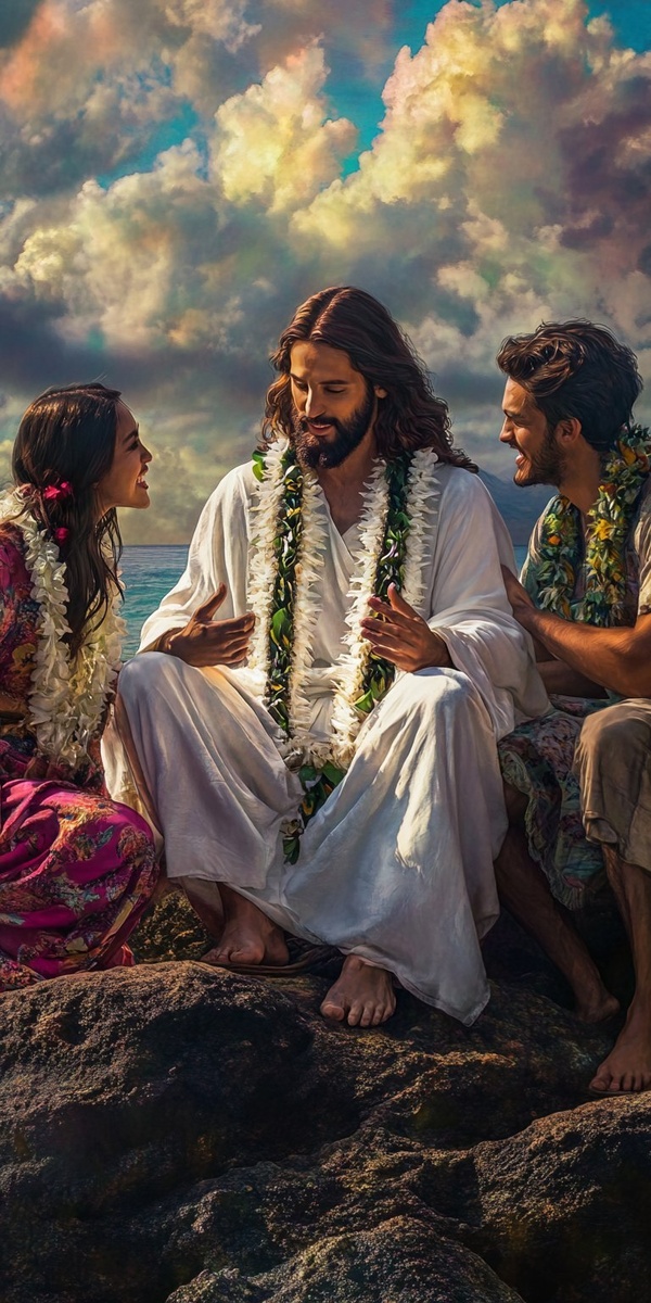 Создано на основе запроса: with strong photorealistic contrast, a loving christ in a white robe wearing a lei sitting on a rock with his