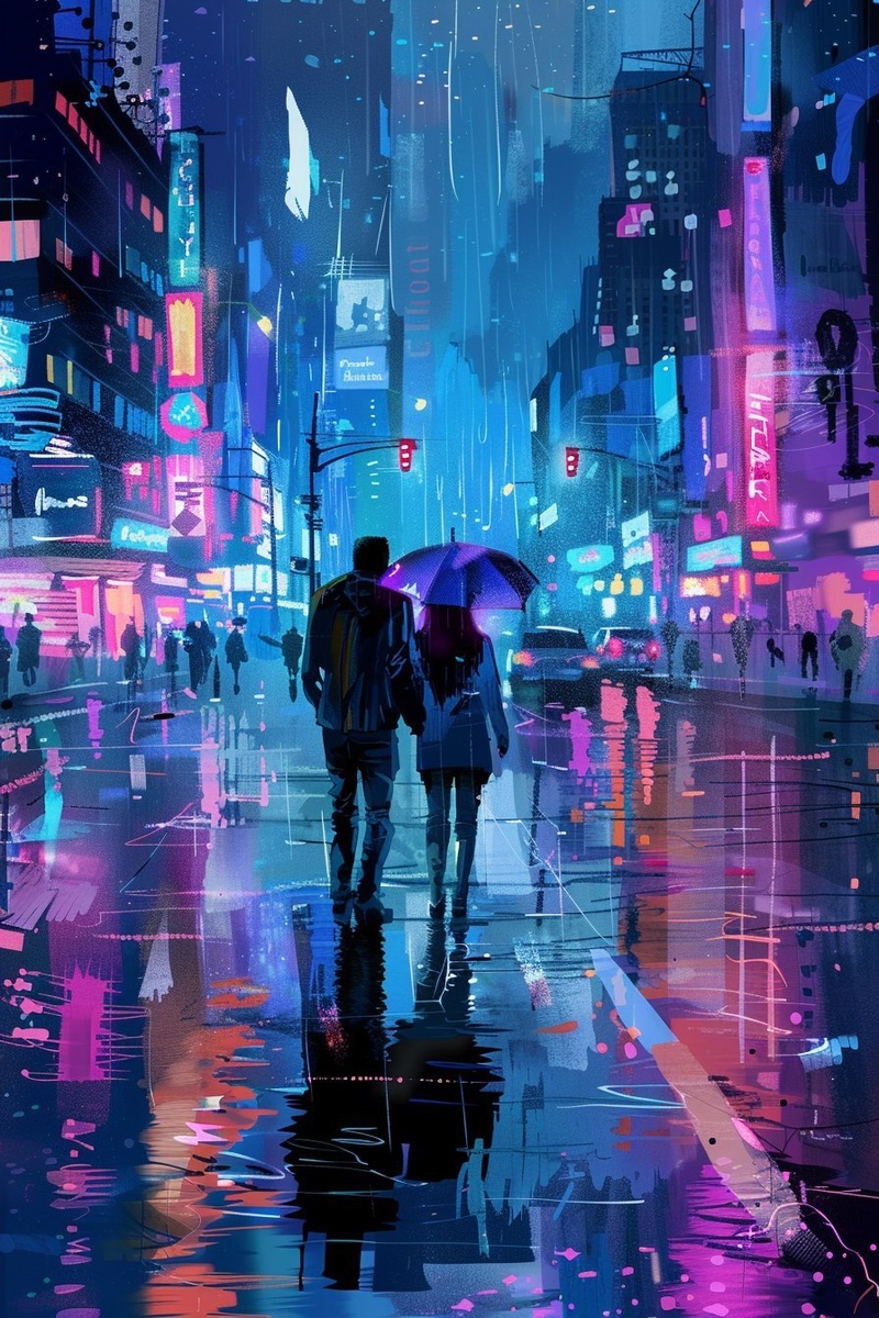 Создано на основе запроса: Book cover design, couple walking together in a rainy neon city at night, cinematic romantic mood, reflections on