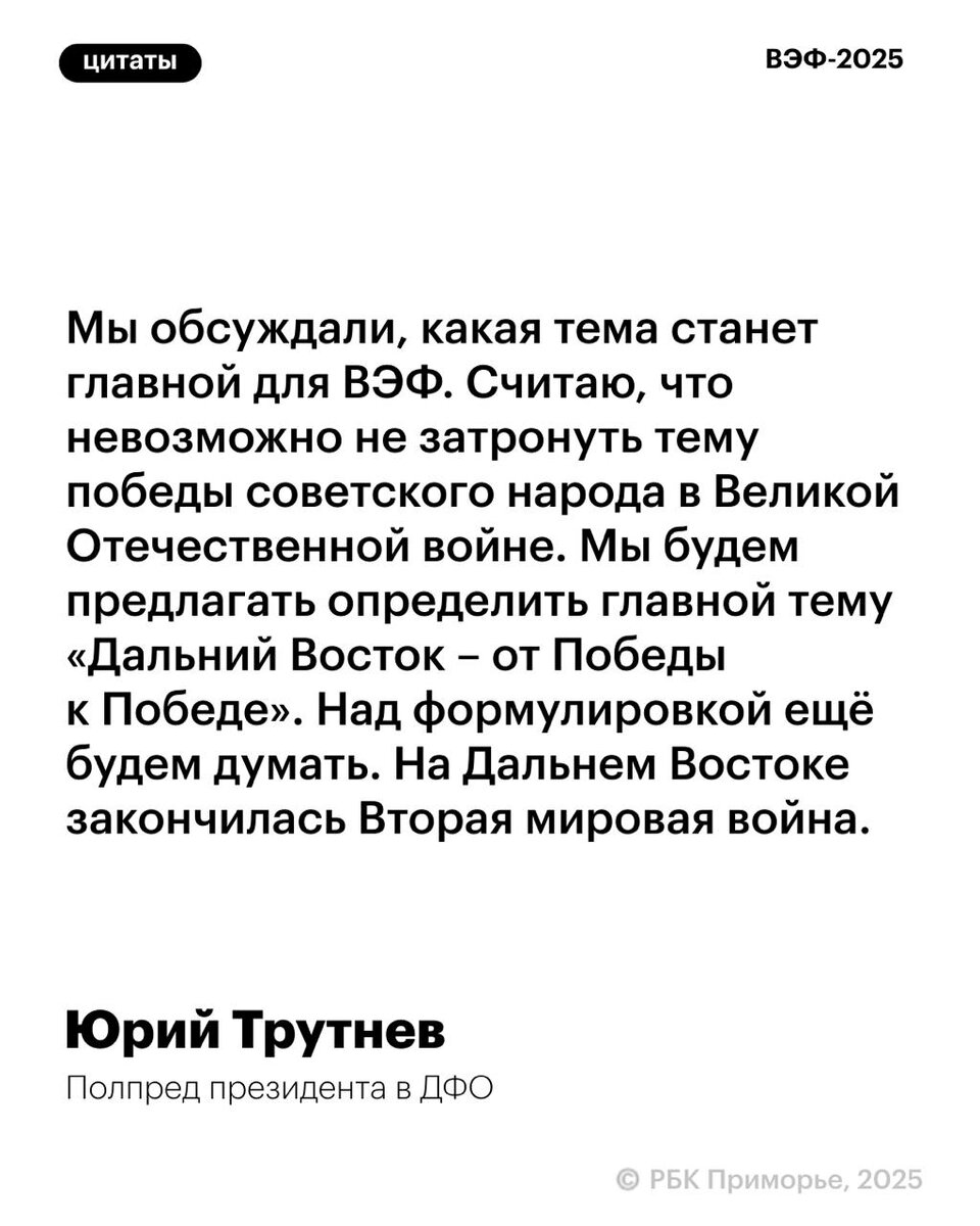 В ответ на пост 💼💼 Главной темой X ВЭФ может стать 80-летие Победы в ВОВ Об этом в ходе совещания по подготовке к проведению форума сообщил полпред президента в ДФО Юрий Трутнев. Напомним, что десятый, юбилейный Восточный экономический форум пройдет во Владивостоке с 3 по 6 сентября. 🍱Подписывайтесь на РБК Восток