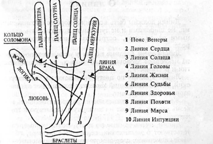 Гадания по линиям ладони, берёт свои корни в древневосточных культурах. Эта практика основана на убеждении, что линии на ладони человека отражают его характер, судьбу и жизненный путь. 1. Линия жизни — окружает большой палец и указывает на продолжительность жизни и жизненную энергию. Длина линии не всегда отражает длину жизни, а больше говорит о качестве жизни. 2. Линия сердца — располагается в верхней части ладони и связана с эмоциями, любовью и отношениями. Длинная и глубокая линия может означать открытость и эмоциональную зрелость. 3. Линия головы — находится ниже линии сердца и отвечает за интеллектуальные способности, умственные процессы и креативность. Длинная линия указывает на аналитический склад ума. 4. Линия судьбы — если она присутствует, проходит вертикально через центр ладони и говорит о жизненном пути, карьерных достижениях и судьбе. 5. Короткие линии — такие как линия здоровья, линии деньги или линии детей, также могут добавлять информацию о различных аспектах жизни. К