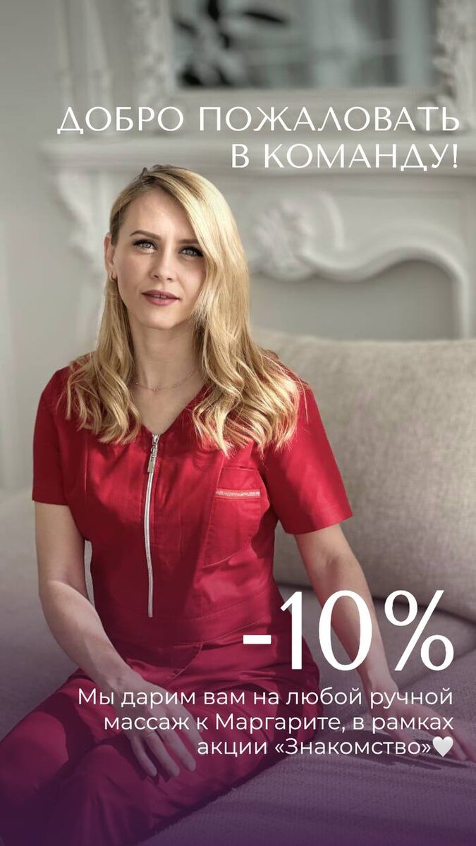 Знакомьтесь: наш новый массажист Маргарита!💜 И в честь старта — дарим 10% скидку на ручной массаж при записи к ней. Почувствуйте заботу рук и эффект уже с первого сеанса! Поторопитесь — предложение ограничено.