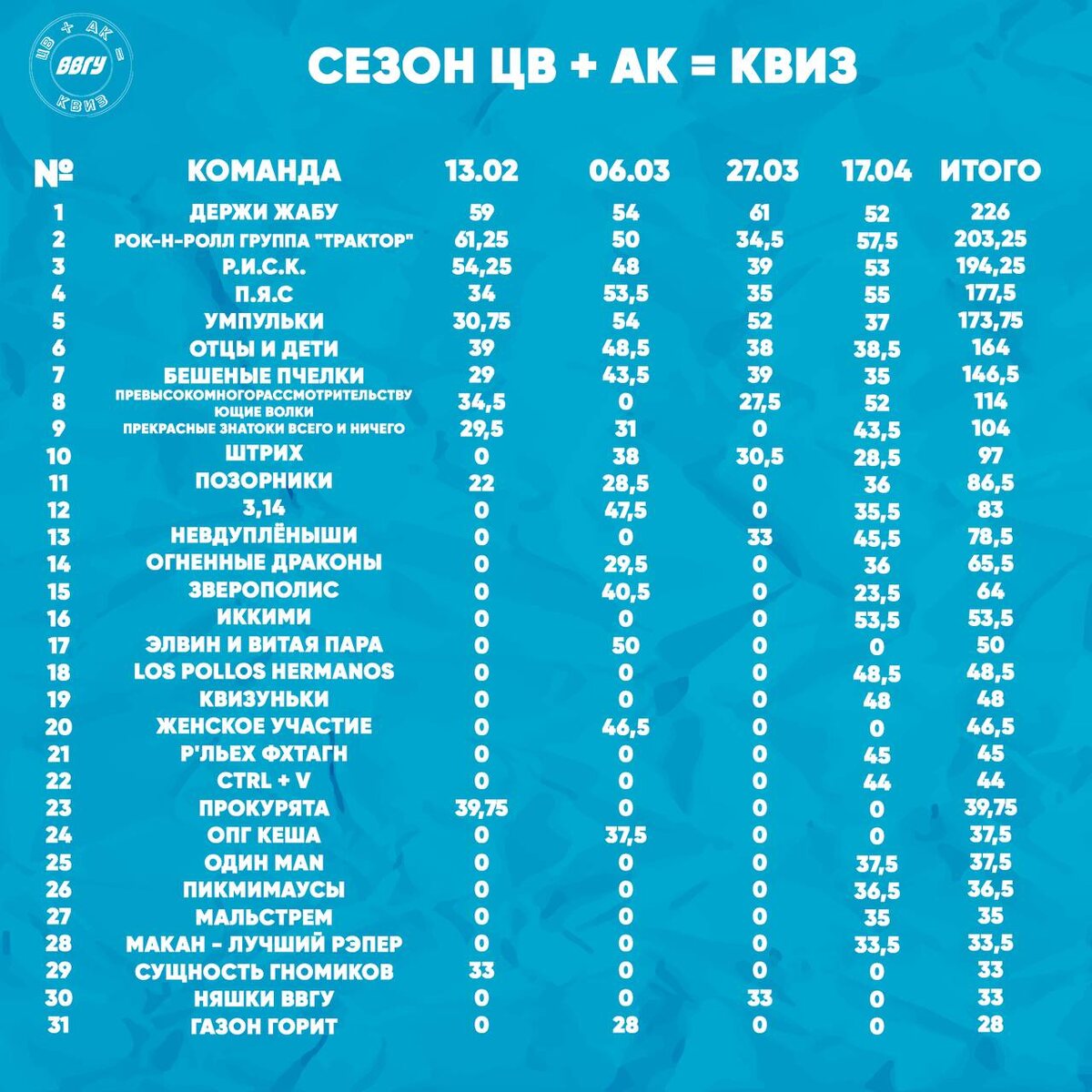Спешим подвести итоги по ВСЕМ, уже проведенным квизам 🥰С рейтингом команд ты можешь ознакомиться на картинке, а мы пока представим тебе лидеров зачётной таблицы на ДАННЫЙ момент: 🥇Держи жабу 🥈Рок-н-ролл группа «Трактор» 🥉Р.И.С.К. Не расслабляйся! Всё ещё может измениться! 7 мая состоится предпоследний квиз перед ФИНАЛОМ нашего Чемпионата квизов😎