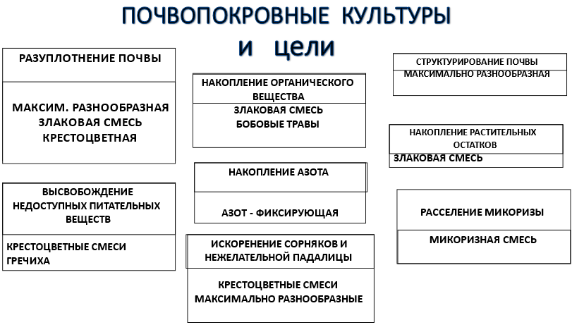 При составлении смеси нужно учитывать зачем они нужны (какая главная цель)? Варианты могут быть разными. Например: мы хотим накопить органику или отдельные питательные вещества сделать доступными для растений, или мы хотим побороться с сорняками. Для разных целей нужно использовать разные культуры. Подбор культур всегда определяется семействами. Это бобовые, злаковые, крестоцветные и так называемые «другие» - представители других семейств. Семена для смесей берем не протравленные. Во время сева мы не используем удобрения. В качестве почвопокровных культур должна быть смесь. Монокультура действует однобоко. Если мы возьмем смесь из 8 культур, это 8 биологических лет. Увеличивается разнообразие, почва обогащается той биотой, которая характерна этим 8-ми культурам. Эти смеси должны быть из культур, которых нет в вашем севообороте. Примеры смесей, которые мы разрабатывали, просчитывали и высевали в Крыму.