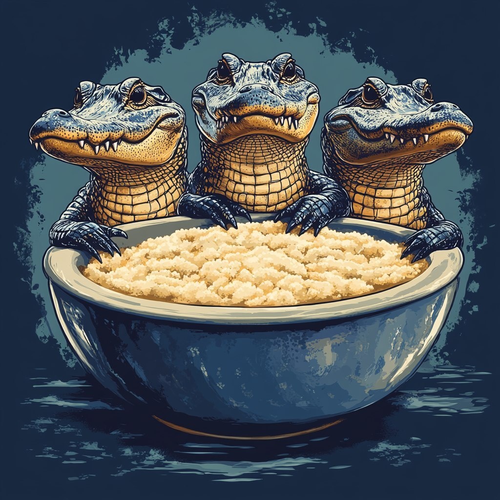 Создано на основе запроса: three alligators sitting behind a bowl of grits Louisiana themed logo