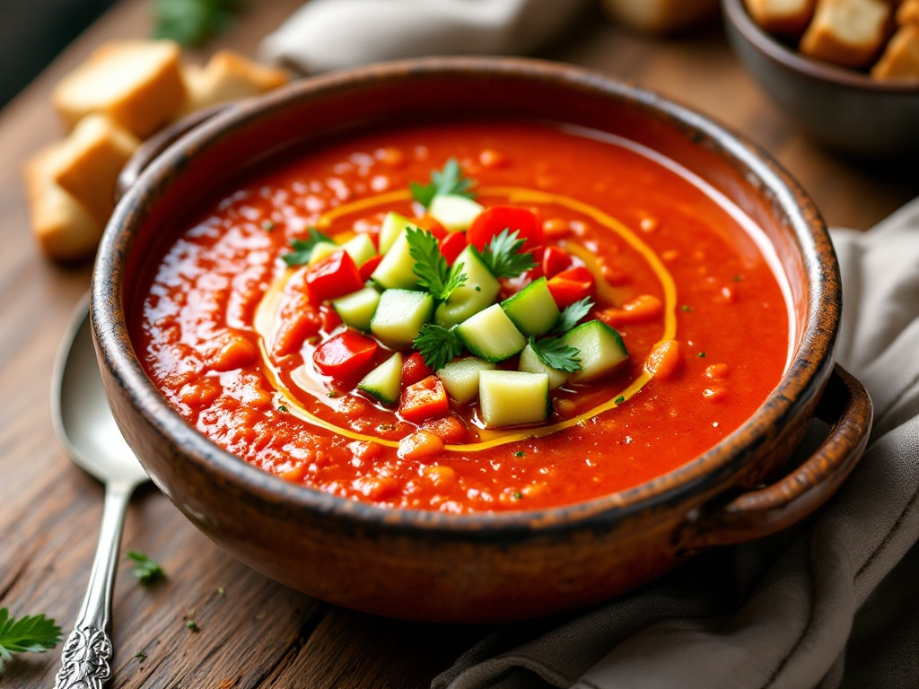 Гаспачо — это идеальное блюдо для жаркого лета: простое в приготовлении, освежающее, полезное и невероятно вкусное. Это как если бы салат решил искупаться в собственном соку и превратился в суп.