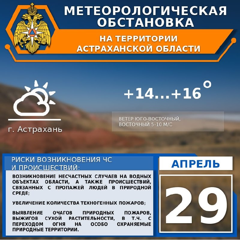 🌎Метеорологическая обстановка на 29 апреля. ☘️На территории области небольшая облачность. Без существенных осадков. Ветер🌬 юго-восточный, восточный, по северу области юго-западный, западный 5-10 м/с. Температура воздуха +12...+17°🌡. 🍀По г. Астрахань небольшая облачность. Без существенных осадков. Ветер 🌬юго-восточный, восточный 5-10 м/с. Температура воздуха +14...+16°🌡.