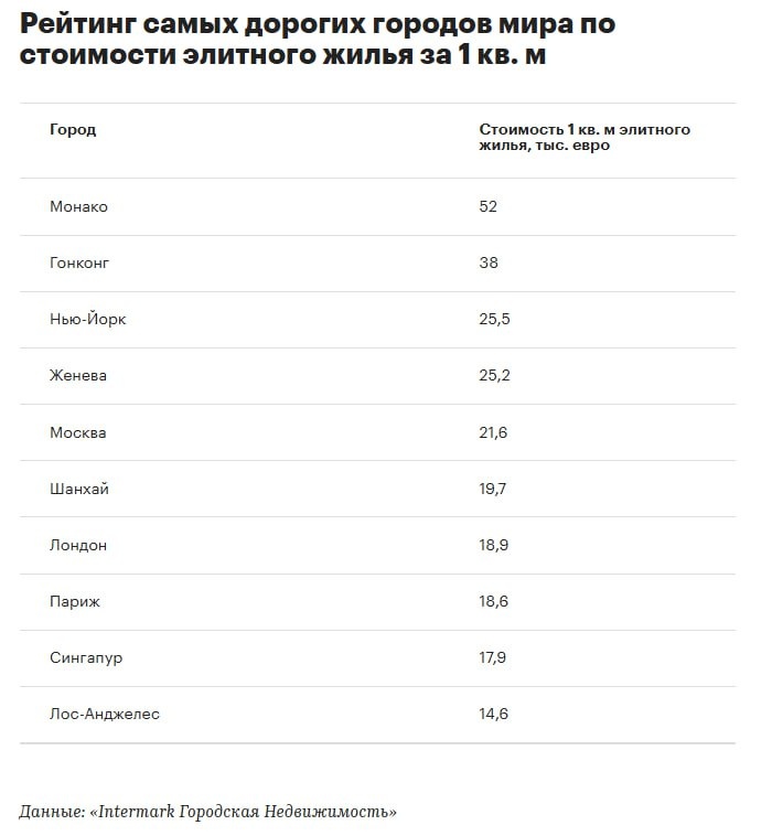 ⚡️ Москва вошла в топ-5 городов мира по цене элитного жилья — Intermark Городская Недвижимость 👉Средняя стоимость 1 м² в новостройках премиум-класса достигла €21,6 тыс. За три года Москва поднялась с 18-го на 5-е место, обогнав Лондон, Париж и Шанхай. Рост цен объясняют введением длительных беспроцентных рассрочек от застройщиков, которые стали активно предлагать с осени 2024 года. Топ-5 городов по стоимости 1 м² элитного жилья: 👉 Монако — €52 тыс. 👉 Гонконг — €38 тыс. 👉 Нью-Йорк — €25,5 тыс. 👉 Женева — €25,2 тыс. 👉 Москва — €21,6 тыс.