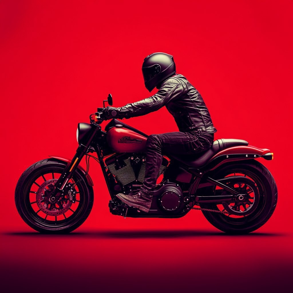 Создано на основе запроса: A cool biker riding a Harley-Davidson motorcycle on solid red background, high contrast, cinematic lighting