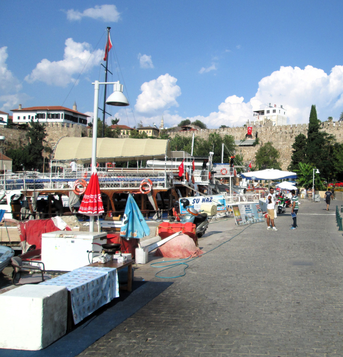 Спускаемся из Старого города Анталья в порт. По дороге конечно же куплено знаменитое турецкое мороженое со всеми положенными выкрутасами продавца. Мороженое быстро тает на солнце, приходится его быстро есть. При этом ветер с море конечно же дул и разносил капли мороженого во все стороны! В порту куча прогулочных кораблей, на любой вкус От такого пиратского разнообразия впору схватиться за столб... Проходим по пирсу... Снова столб для фотосессии Выйдем дальше к открытому морю. Видна крепость Антальи. Пляж Мермерли. Где то в море уже счастливцы рассекают на пиратском корабле! Нагулявшись в порту идем к панорамному лифту... Неприметная дверка... Панорамный лифт Калеичи (Kaleiçi Panoramik Asansör) — стеклянный подъёмник в Анталье, который соединяет центральную площадь Республики и исторический район Калеичи, где находится морской порт и набережная города. Некоторые особенности лифта: