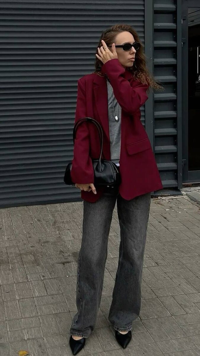 Бордовый вельветовый пиджак — отлично подходит для создания casual образов. Вельвет, как текстура, добавляет глубину и визуальный интерес, а бордовый цвет придаёт образу элегантность и тепло. Как комбинировать бордовый вельветовый пиджак: 1. Синие джинсы клеш: Они прекрасно контрастируют с бордовым пиджаком и добавляют нотку ретро в образ. Клеш подчеркивает силуэт, создавая гармонию между верхом и низом. 2. Топы: Под пиджак можно надеть простой белый или светлый топ, который создаст свежий и светлый контраст. Также подойдут блузы с ярким принтом или пастельные оттенки для более романтичного стиля. 3. Обувь: Для завершения образа можно выбрать казаки, клоги или кеды для более relaxed стиля. Если хотите добавить немного шика, подойдут туфли или сандалии на каблуке. 4. Аксессуары: Не забудьте про аксессуары! Золотые или серебряные украшения, яркая сумка или шарф в тон пиджаку добавят завершенности образу. 5. Прическа и макияж: Легкие волны или собранные волосы подчеркнут стильный о
