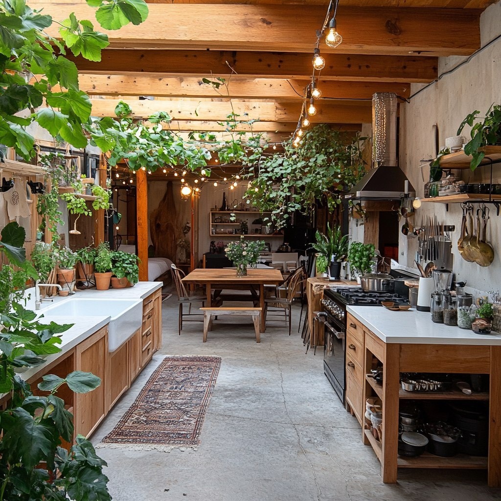 Создано на основе запроса: a modern ecological home for a hippie lesbian couple that is mainly white, black and wood finishes. The home’s center is an enclosed courtyard with above ground plants and a salt water hot tub that blends seamlessly with the plants and style. There’s a space for eating and string lights. There are two workshops and a main bedroom with a bathroom and a guest room with an adjoining bathroom. There is also a living room and kitchen all with a modern bohemian style. Please show me the kitchen. --- Автоперевод: Современный экологический дом для лесбиянок хиппи, которая в основном белая, черная и деревянная. Красиво выглядит? 🤔 https://dzen.ru/id/65c0c65c86e4f837c27b24d7 #ИИ #AI #нейросеть #midjourney #art
