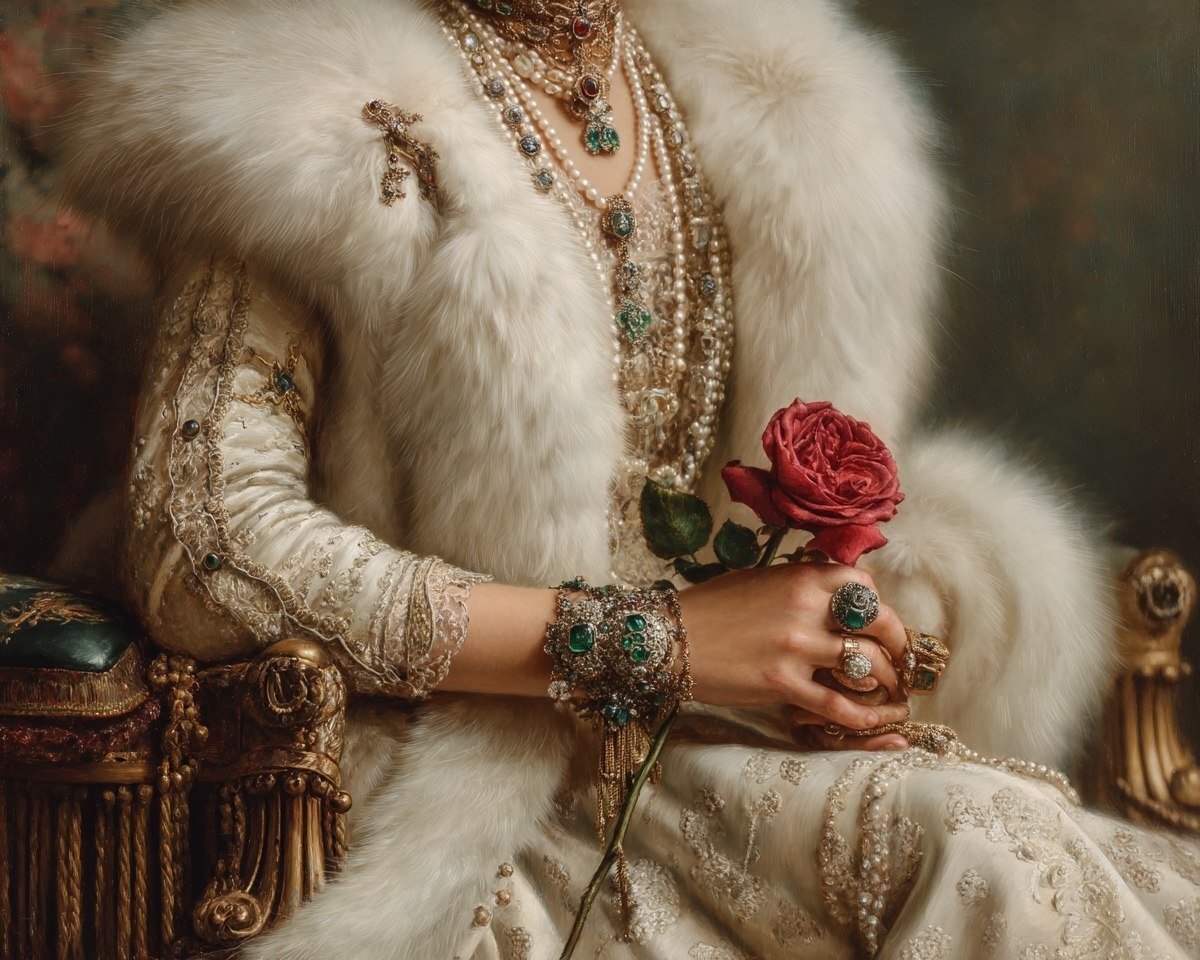 Создано на основе запроса: A close-up of an elegant lady's hand with exquisite rings, adorned by her wrist is a golden bracelet encrusted in sapphires and emeralds. She wears a white fur coat and sits on a chair, holding a single red rose in her hands, in the style of John Singer Sargent. --- Автоперевод: Крупным планом элегантной руки руки с изысканными кольцами, украшенной ее запястью, является золотым браслетом, инкрустированным сапфирами и изумрудами. Отлично получилось? 🤔 https://dzen.ru/id/65c0c65c86e4f837c27b24d7 #ИИ #AI #нейросеть #midjourney #art