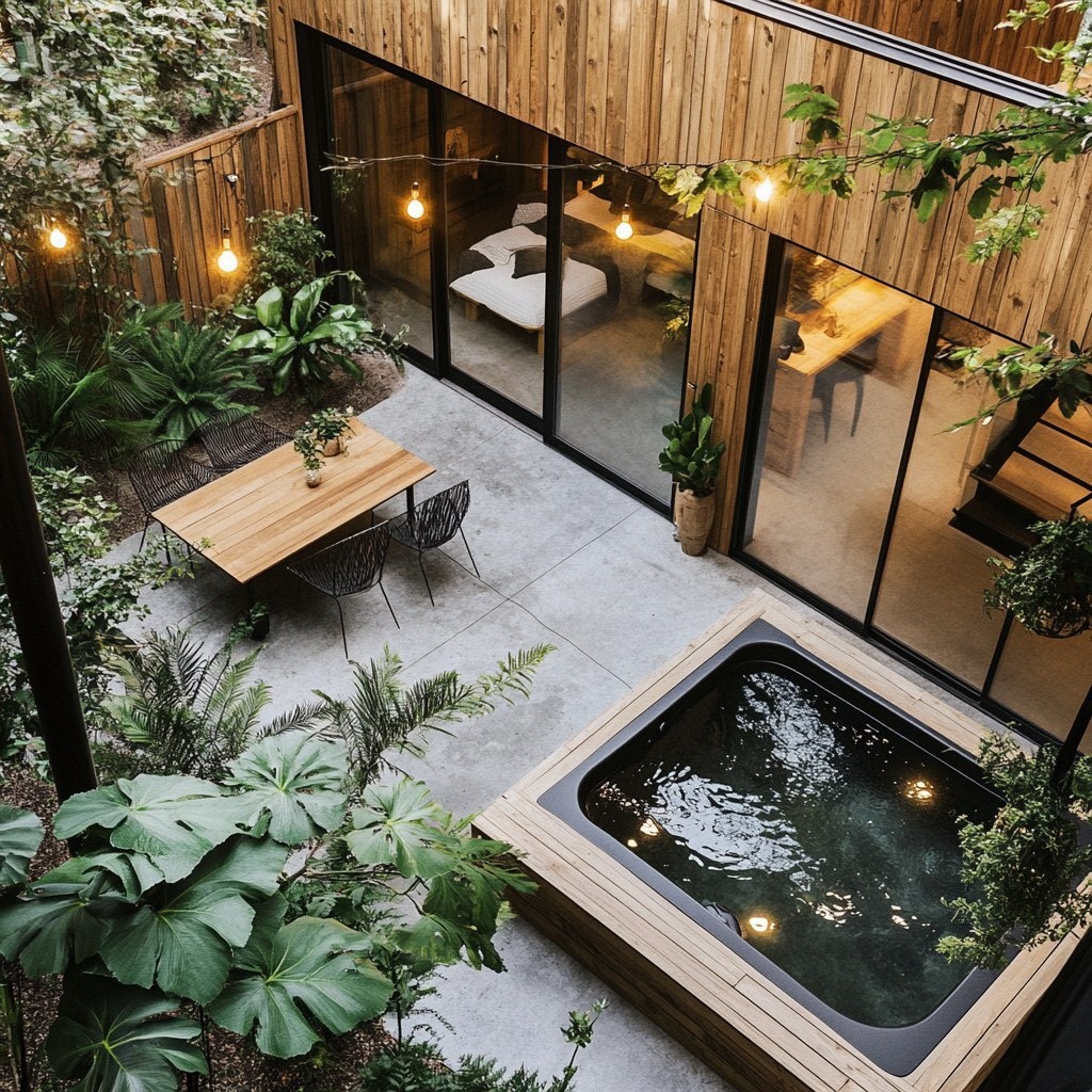 Создано на основе запроса: a modern ecological home for a hippie lesbian couple that is mainly white, black and wood finishes. The home’s center is an enclosed courtyard with above ground plants and a salt water hot tub that blends seamlessly with the plants and style. There’s a space for eating and string lights. There are two workshops and a main bedroom with a bathroom and a guest room with an adjoining bathroom. There is also a living room and kitchen all with a modern bohemian style. Please give me a layout for a builder. --- Автоперевод: Современный экологический дом для лесбиянок хиппи, которая в основном белая, черная и деревянная. Необычно выглядит? 🤔 https://dzen.ru/id/65c0c65c86e4f837c27b24d7 #ИИ #AI #нейросеть #midjourney #art
